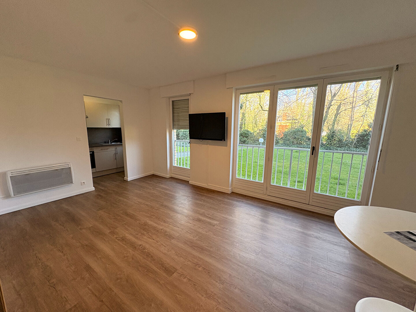 Il se compose d'une entrée avec machine à laver séchante et rangement, wc séparés, séjour/salle à manger parqueté avec canapé, table, chaises et tv, donnant sur un grand parc, d'une cuisine semie séparée équipée et aménagée (meubles hauts et bas, four, réfrigérateur, plaques vitros céramiques, hotte), une chambre avec placard intégré, une salle de bain avec douche à l'talienne, meuble vasque et sèche-serviette. Les plus : une place de parking en sous sol et un local vélo. Disponible de suite ! Loyer de 670 euros et 80 euros de charges.