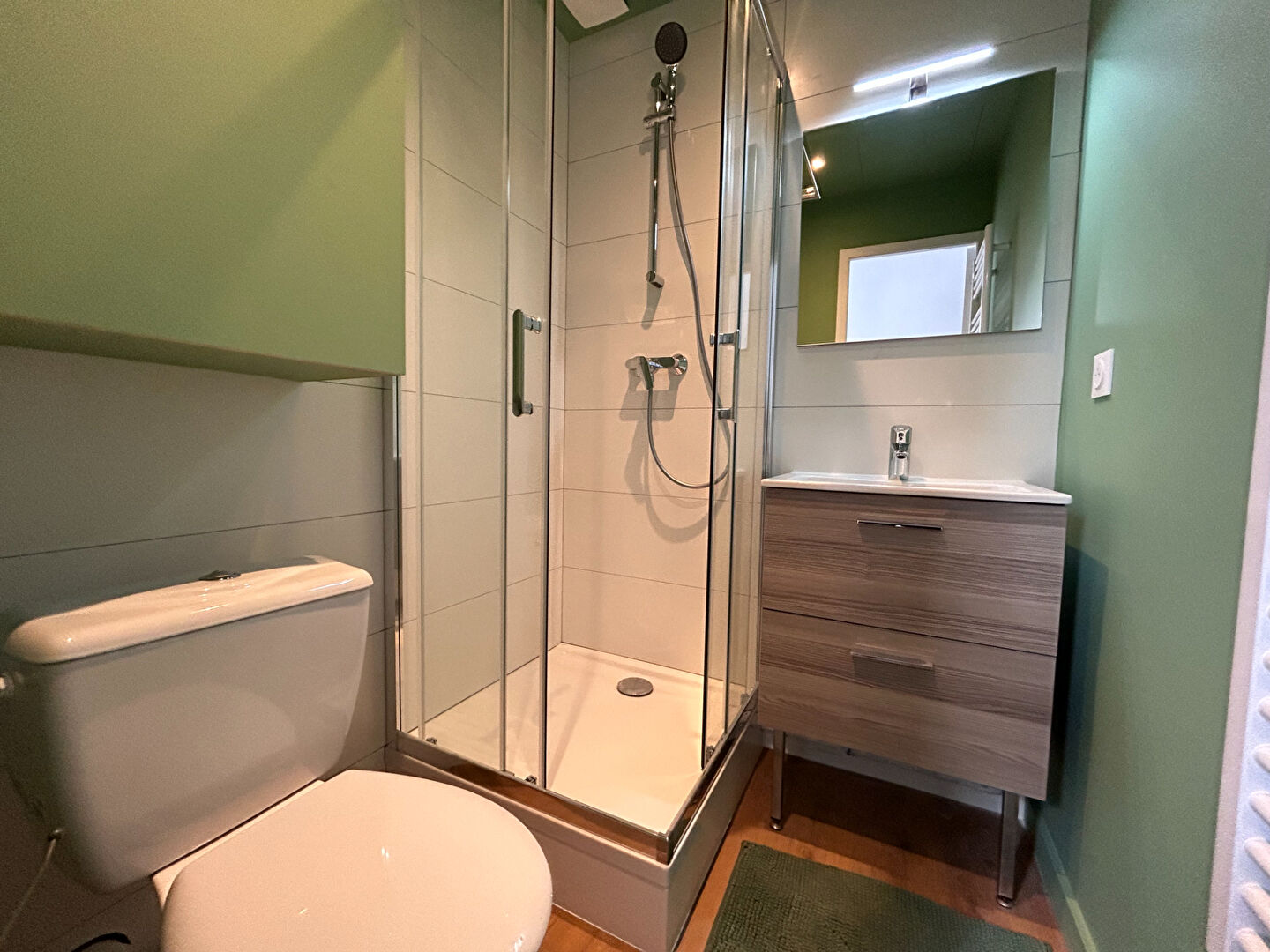 A l'arrière du bien se trouve une salle de douche avec douche, sèche-serviette, lavabo et WC. Disponible à partir du 04/05/2026.