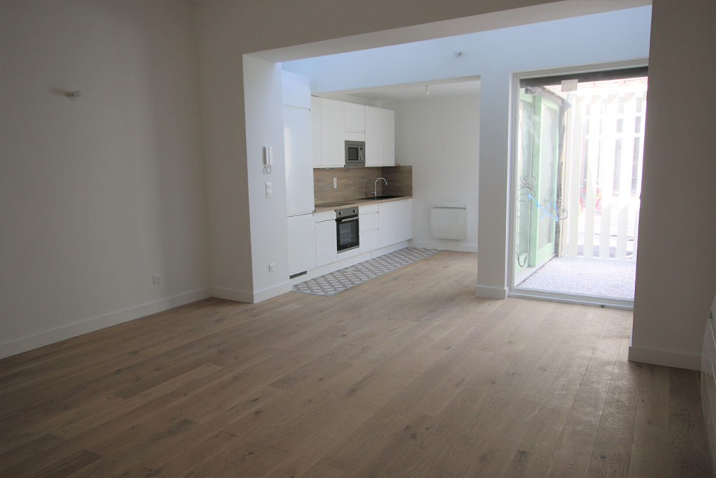 A LOUER, rue Brûle Maison, Référence 00749-001 T3 NEUF de 83.19 m² situé au RDC en fond de cour.Il comprend un grand séjour avec cuisine équipée (plaque, hotte, four, lave-vaisselle, micro-ondes, frigo et congélateur) donnant sur un patio, deux chambres avec placards (dont une avec mezzanine et salle de douche (douche et meuble vasque), une salle de bains (baignoire, meuble double vasque, emplacement lave-linge), wc séparés.
