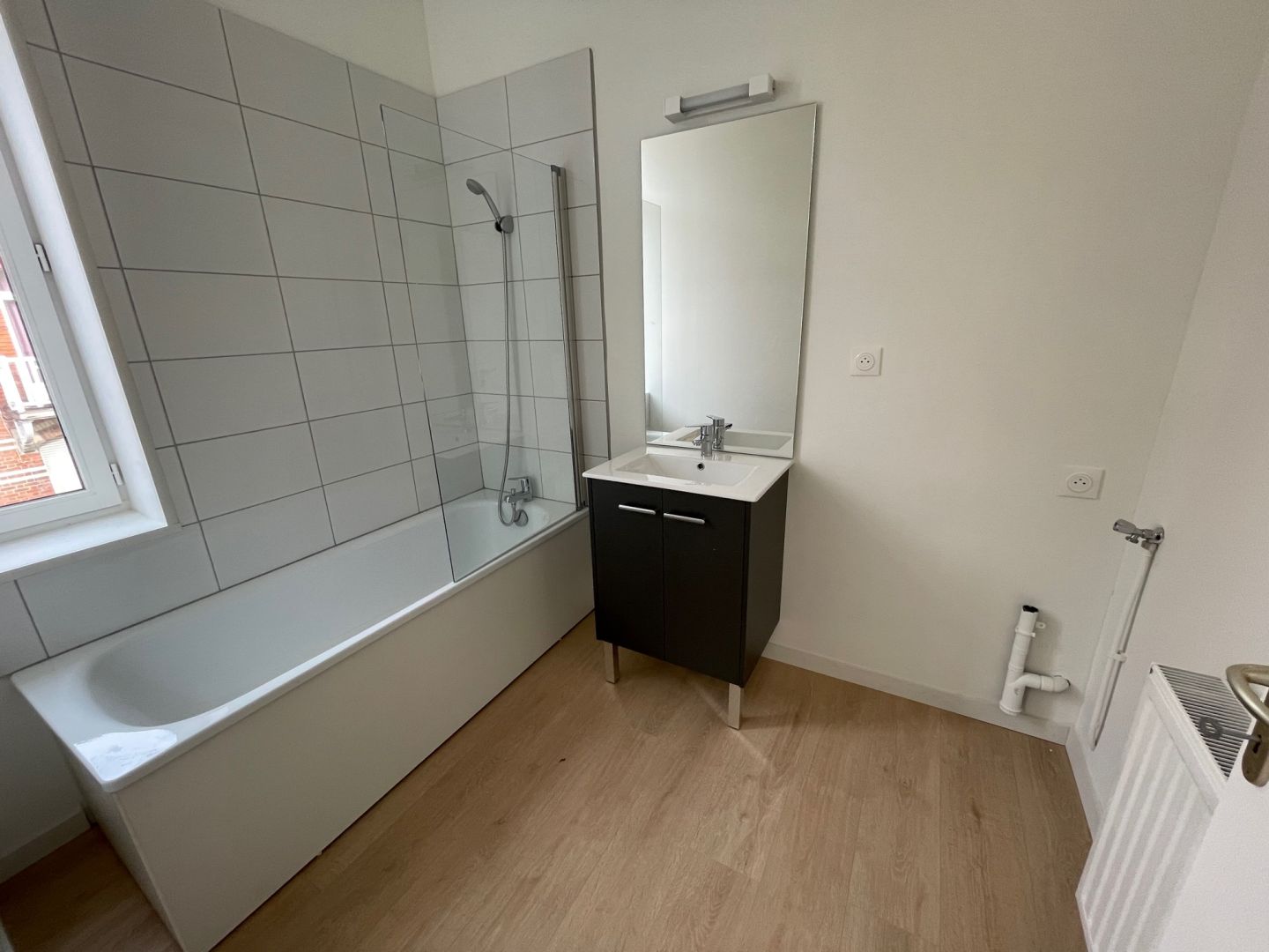 A LOUER, Rue de Lannoy Référence G446-3 T3 bis en triplex avec une cour privative orientée plein sud, complètement neuf situé au 8 rue de Lannoy à Lille dans le quartier de Fives, à 2 pas du métro. Il se compose au rez de chaussée, d'une entrée parquetée donnant sur une pièce de vie avec coin cuisine aménagée et équipée (plaques, hotte, four, rangements) ainsi que des WC séparés. Au premier étage se trouvent une chambre et la salle de bain avec baignoire, meuble vasque, WC et branchement Mal).Le deuxième étage se compose d'une chambre et d'un bureau/dressing/chambre de bébé.