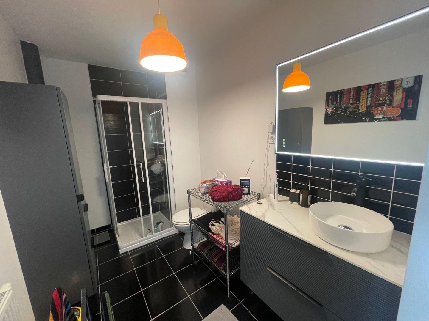 Une salle de bain avec douche, meuble vasque, machine à laver et une chambre avec lit et dressing. Une place de parking en sous-sol complète ce bien ! Disponible le 08/02/2026.