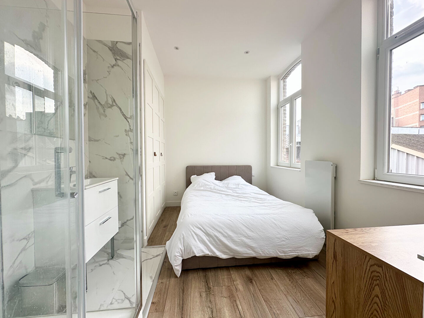 Situé à l'arrière d'un bel immeuble bourgeois dans l'hyper centre ville de Lille, au premier étage avec ascenseur.splendide appartement type 2 en duplex entièrement refait à neuf Il se compose d'un hall d'entrée menant sur une cuisine équipée, un dégagement avec WC séparés, buanderie. Un Séjour lumineux avec rangement et extérieur, et à l'étage une belle chambre baignée de lumière avec douche à l'italienne. Aucun vis à vis, idéal pour investissement ou logement étudiant. Charges de copro : 120 euros/mois Chauffage électrique DPE C Copropriété de 15 lots - dont 14 lots habitation.